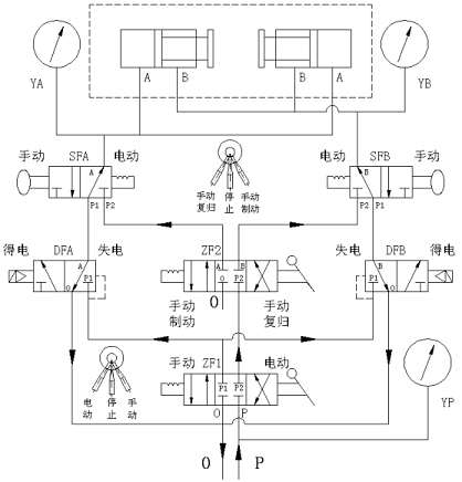 手動制動:電磁閥在失電的狀態(tài)下,方可轉為手動操作。至手拉閥SFA、SFB、轉閥ZF1于手動狀態(tài),當滿足機組停機條件時,轉閥ZF2轉到手動制動狀態(tài),使氣體進入制動腔,制動器動作加速機組停機。