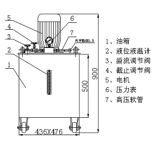 8、油 箱尺 寸:430X470X500; 外形尺寸:436X476X900;